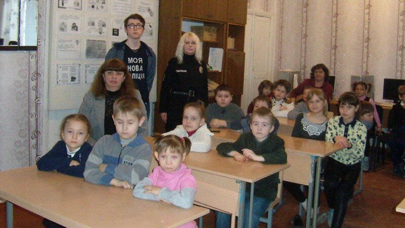 Учасник костянтинівської "Ліги майбутніх поліцейських" Сергій Макаров, під час поїздки до Олександро-Калинівської школи, разом з інспектором ювенальної превенції Костянтинівського відділення поліції Оленою Дужак провели для дітей пізнавальний урок на тему "вибухонебезпеки".